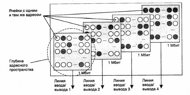 Таким образом, общая емкость микросхемы памяти определяется произведением глубины адресного пространства на количество линий ввода/вывода (разрядов). Например, емкость микросхемы памяти, имеющей глубину адресного пространства 1 Мбит и 4 линии ввода/вывода (четырехразрядную шину ввода/вывода), составляет 1 Мбитх4 = 4 Мбит.